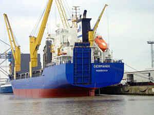 MS Germania der Hartmann Schiffahrts GmbH in Leer, Liberianische Flagge, gebaut 1993 durch Brand Werft Oldenburg, Länge 125,2 m, Breite 19 m, Verdrängung beladen 13296 t. |