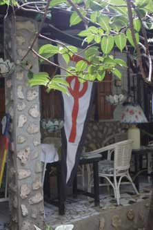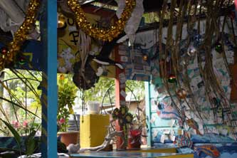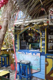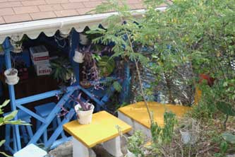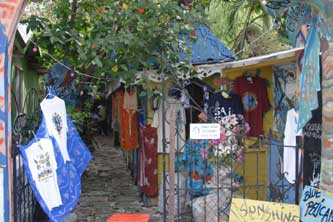Seit vielen Jahren lebt Jutta auf Union Island in den Grenadines. In muehevoller Arbeit haben Sie und ihr Partner ein grosses Stueck Land zu einem kleinen Paradies gemacht. Farbenfroh und bunt, exotische Pflanzen ueberall. Es gibt zwei Bars, einen Laden mit handbemalten T-Shirts und Kleidern, eine Galerie mit ihren Bildern, zwei kleine Ferienhaeuser, ihren Privatstrand mit Bootsanleger. Ihre Vitalitaet und Lebensfreude stecken an. |