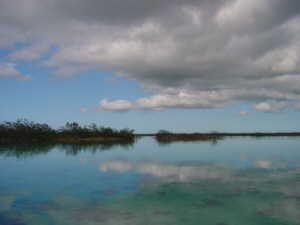 Am Suedende der Insel ist das einzige hurricane hole weit und breit: Hawk's Nest Creek, an dem auch die einzige Marina weit und breit liegt: Hawk's Nest Marina. 17 Liegeplaetze gibt's hier, davon 10 leer. Angeschlossen ist eine winzige Hotelanlage, ebenfalls halb leer, wo wir nach einer Stunde zur Familie gehoerten. Die Tauchlehrer der Anlage stammen uebrigens aus Koeln, was Gabriele zu ihrem ersten Tauchgang seit Jahren verhalf. Dieser muss sehr schoen gewesen sein, wenn auch die Begegnung mit einem 4m langen Hammerhai nicht unbedingt eingeplant war. Drei Tage haben wir in der Marina Urlaub gemacht und uns so richtig verwoehnen lassen. Dann war wieder die Einsamkeit unserer Ankerplaetze angesagt. Hier waeren wir gerne viel laenger geblieben, wenn die Bahamas nur nicht so schweineteuer waeren... |