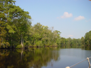 aus faehrt man zunaechst den breiten Pasquotank River hoch bis Elizabeth City, einer