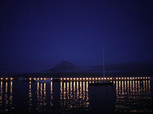 Wunderschön der nächtliche Blick über den beleuchteten Hafen zum Pico, dem gewaltigen